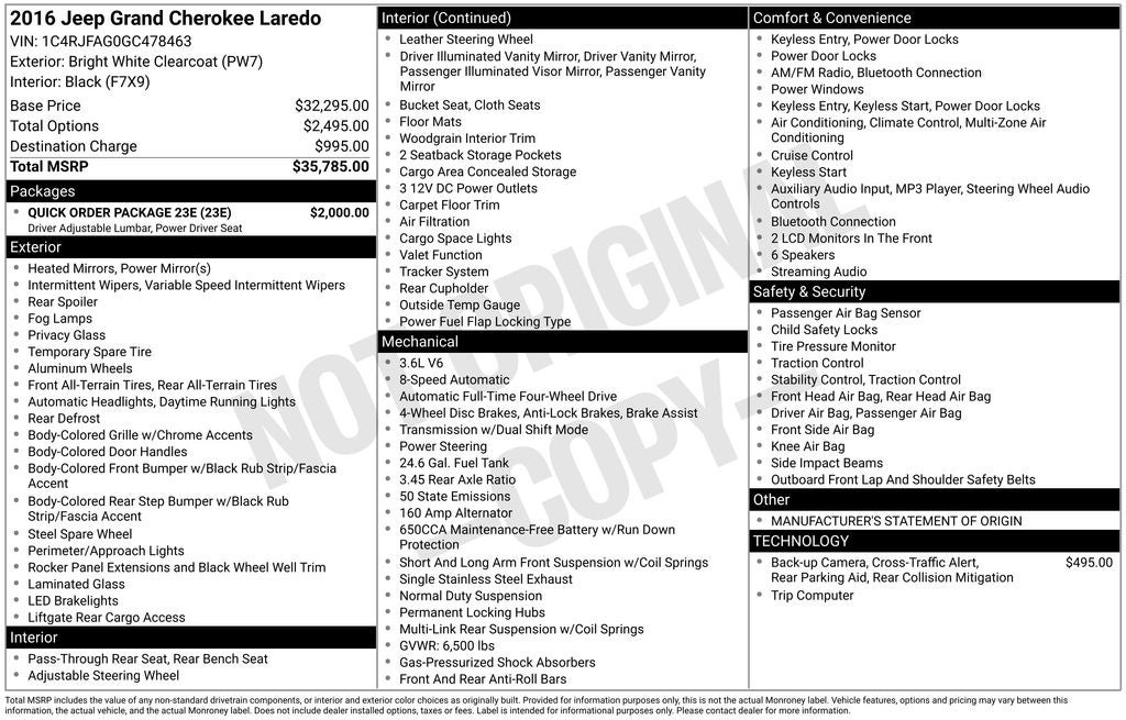 With its sleek design, advanced technology, and exceptional performance, this 2016 Jeep Grand Cherokee Laredo is the perfect blend of style and substance. Visit our showroom today to experience it for yourself and discover why it's the ideal choice for your next vehicle.