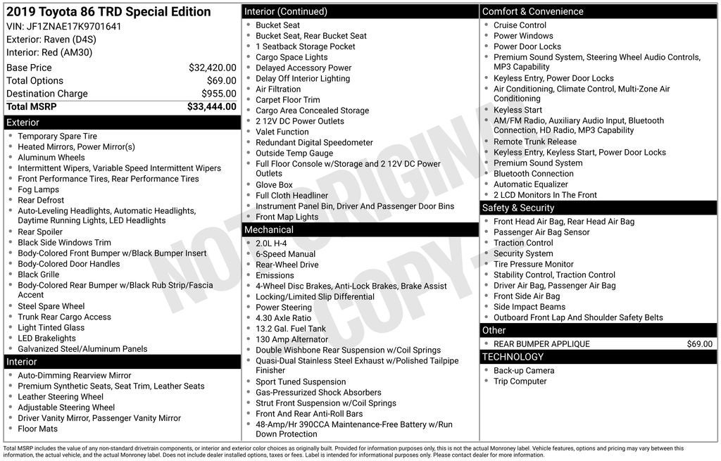 Beneath the sleek black exterior lies the heart of a true driver's car. The 2.0L H4 PDI DOHC 16V engine delivers an exhilarating 205 horsepower, seamlessly channeled through the close-ratio 6-speed manual transmission and rear-wheel-drive system. With a remarkable fuel efficiency of 21 mpg in the city and 28 mpg on the highway, this 86 TRD Special Edition combines power and practicality.