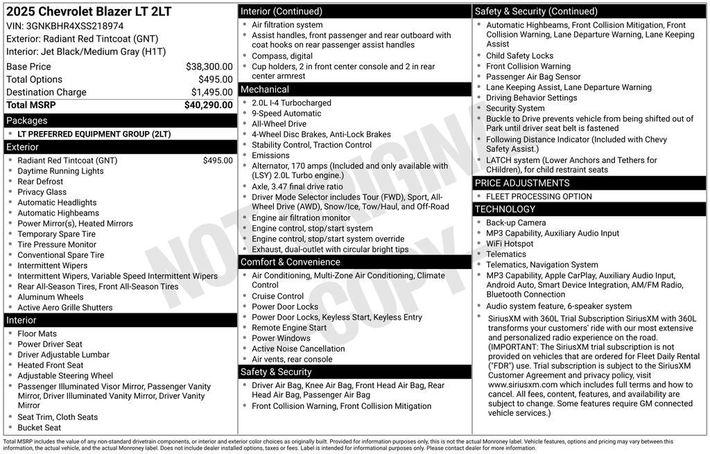 Discover the perfect blend of style, capability, and technology in the 2025 Chevrolet Blazer LT. This dynamic SUV commands attention with its bold Radiant Red Tintcoat exterior and refined Preferred Equipment Group 2LT features. Step inside and experience the premium Chevrolet Infotainment 3 Plus system, which seamlessly integrates your smartphone via Apple CarPlay and Android Auto. Stay connected and entertained on every journey.